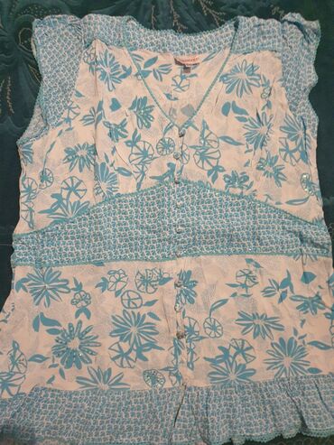 Ženska košulja/bluza sa kratkim rukavima i printom novinskih naslova, tačkica-zareza, srca i leptira. Materijal je lagan i prozračan, idealan za tople dane. Klasična kragna i kopčanje napred dugmić...