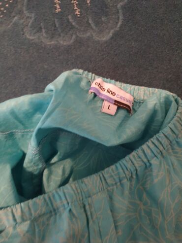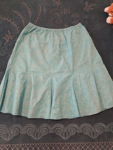 A-krojSuknja veličine L, u nježnoj plavoj boji s diskretnim uzorkom listova. Suknja je lepršava i ima široki elastični pojas za udobno nošenje. Idealna je za proljetne i ljetne dane.