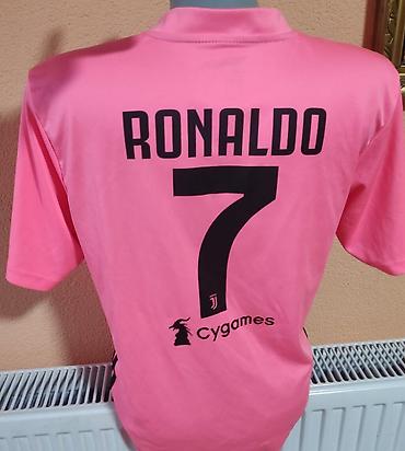 Juventus dres – roze treća/alternativna varijanta, Adidas. Prednja strana sa crnim Jeep logotipom, Juventus grbom sa tri zvezdice i štitom u bojama Italije. Na leđima natpis RONALDO i broj 7, sa Cygames logom. Kratki rukavi, V-izrez, bočne crne Adidas pruge. Materijal lagan, sintetički, prijatan za sportske aktivnosti. Oznaka veličine: 176 (Adidas). Idealan za navijače Juventusa i kolekcionare dresova Cristiana Ronalda.