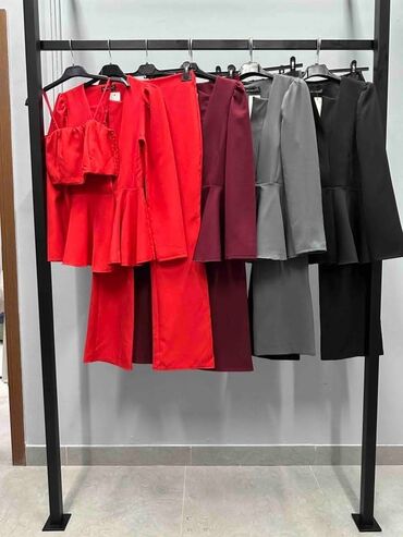 - Trodeleni set: strukirani sako sa peplum krojem, uske pantalone sa zvonastim završetkom i kratki top.