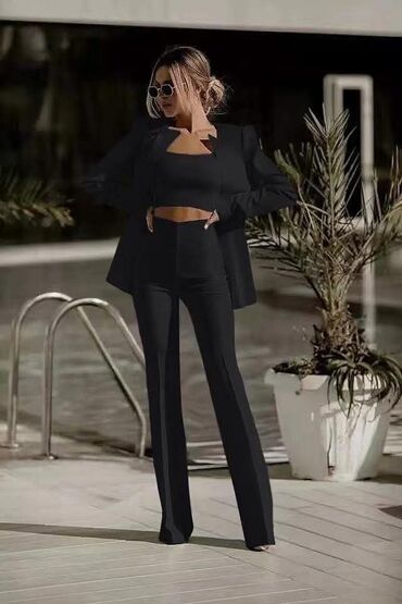- Detalji: čiste linije, diskretan peplum efekat na sakou, elastičnost u struku pantalona za dodatnu udobnost.
