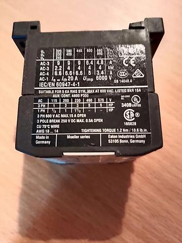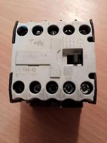 EATON KONTAKTOR DIL EM-10 XTMC9A10 220VAC | EATON kontaktor DIL EM-10 XTMC9A10, nov, nekorišten, sa 4 NO kontakta. Tri para kontakata su do 9A dok je pomoćni kontakt do 6A. Napon pobude je 220VAC 50 Hz. Montaža na standardnu DIN šinu 35mm ili sa četori vijka M$ odgovarajuće dužine prema mestu ugradnje. Tehničke karakteristike: - Proizvođač: EATON- Tip: DIL EM-10 XTEMC9A10- Kotakti 3xNO od 9A i 1xNO od 6A- Pobuda 220VAC 50Hz- Mogućnost povezivanja do 4kW- Ožičenje provodnicima do 4mm2- Dimenzije: 46x58x52mm. ARTIKLE NE ŠALJEM VAN TERITORIJE REPUBLIKE SRBIJE! Kupac plaća artikal, pouzećem, zajedno sa poštarinom. Reklamacije primam, preko ovih poruka, sedam dana nakon prijema artikla. Nakon isteka ovog roka, ne primam reklamacije.