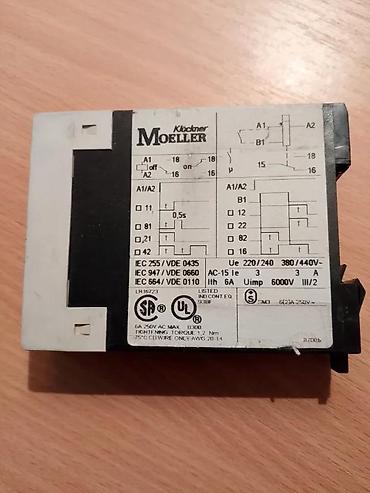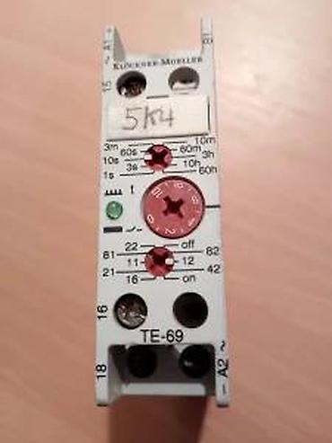 KLOCKNER MOELLER VREMENSKI RELE TE69-A | Multifunkcionalni vremenski rele TE 69-A. 8 osega delovanja, sa jednim preklopnim kontaktom. Namena je višestruka, zavisno gde treba da se upotrebi. Montaža je predviđena za DIN šinu od 35mm, ali je neispravna kopča. Sve ostale funkcije su ispravne. Delovanje je dato na dijagramima. Povezinanje provodnicima do 2,5 mm2 Tajmer je polovan, demontiran sa rashodovane mašine. Napomena: Na ovaj artikal nema reklamacije. Dimenzije: Dužina: 101mm, Visina: 76mm, Širina: 23mm Povezinanje: Na kontakt 15: FazaNa kontakt 16: NZNa kontakt 18NONa Kontakte A1 i A2: napajanje ARTIKLE NE ŠALJEM VAN TERITORIJE REPUBLIKE SRBIJE! Kupac plaća artikal, pouzećem, zajedno sa poštarinom.