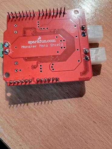 - SparkFun Monster Moto Shield PCB sa zalemljenim headerima, dva VNH2SP30 H‑bridge čipa, 2× elektrolitska kondenzatora 470 µF/35 V, šrafni priključak za napajanje, dva izlazna konektora za motore, integrisana zaštita i diagnostika.