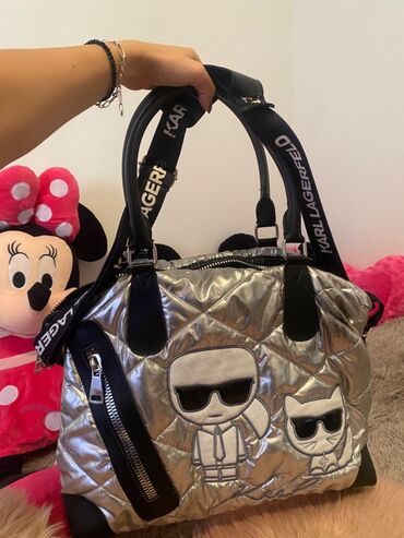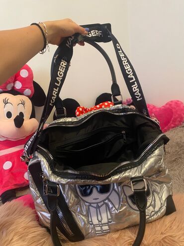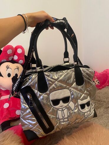 Crna uniseks torba - Materijal: kombinacija glatke kože (gornji deo i preklop) i čvrstog platna (korpus) - Boja: crna, metalni okovi u srebrnoj boji - Dizajn: minimalistički, utisnuta oznaka/serij...
