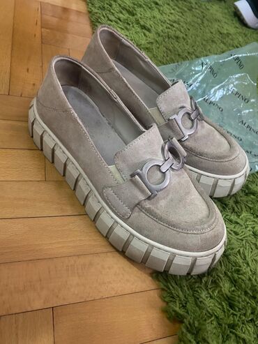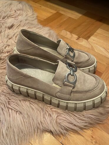 Ženska obuća – više modela 1) Elegantne cipele, braon, špicast vrh - Materijal: glatka koža - Klasičan mokasin/loafer kroj sa dekorativnim preklopom - Uložak sa natpisom „PRADA” - Niska potpetica,...