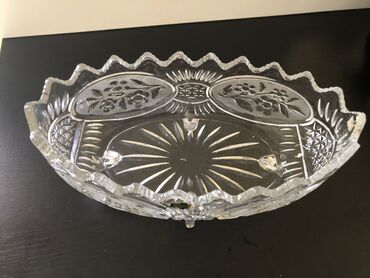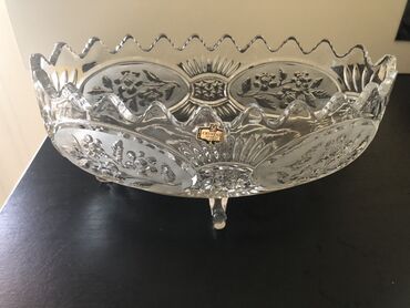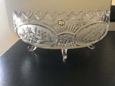 Kristalna dekorativna činija, elegantna i teška, na četiri nožice, koja unosi tradicionalni sjaj u svaki enterijer. Odaje jasno i briljantno prelomljavanje svetlosti, klasičan vintage dizajn. Dimenzije: 28 cm, širina 14 cm, visina 11 cm.