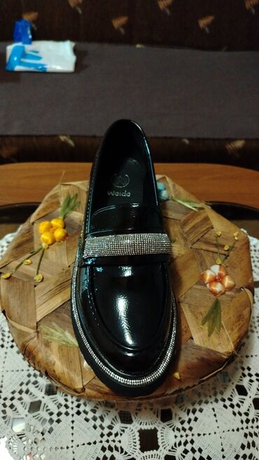 Crne ženske mokasine – lakovana koža, klasičan penny dizajn. - Brend/oznaka: Comfort (natpis na ulošku) - Veličina: 39 (otisnuto sa strane) - Materijal gornjišta: sjajni lak (lakovana završna...