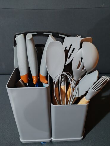 Sve što vam treba za svakodnevno kuvanje u jednom setu, u modernoj sivoj boji sa drvenim i silikonskim elementima. Pribor dolazi u dvojnome stalku/organizatoru za uredno odlaganje.