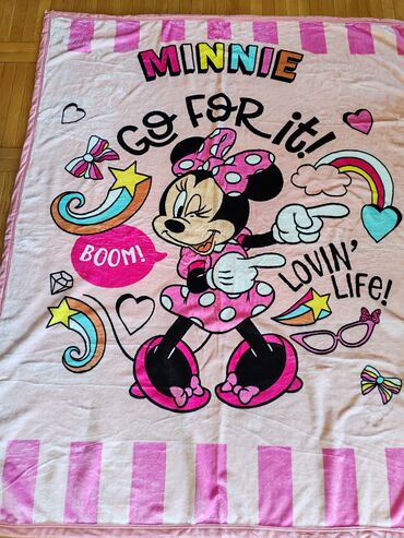 - Dve dekorativne i tople flis deke sa motivima Disney likova: jedna sa Mikijem (plavo-žute pruge, veliki lik Mickey i natpis “MICKEY”), druga sa Mini (svetloružičasta sa prugama, natpisima “MINNIE”, “GO FOR IT!”, “Lovin’ Life!” i ilustracijama srca, zvezdica, mašnica i duge).