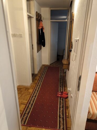 - Hodnik: dugačak ulazni hodnik sa zidnim telefon/interfon sistemom, drvenim čivilukom, ugradnim plakarom i stazom preko parketa.