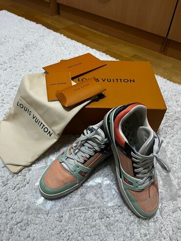 - Boje: breskva/narandžasta baza, mint zelene i svetlosive kožne aplikacije, crni i plavi akcenti, crvena peta sa LV detaljima, svetlosive pertle