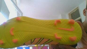 - Potplat za prirodnu travu: raspored krampona u obliku slova V i U za ubrzanje, promene pravca i kočenje; kramponi i Nike logo u neon‑narandžastoj.