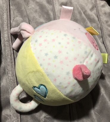 Dodatak: velika mekana plišana loptica/igračka u pastelnim bojama (roze, žuta, plava, bela sa zvezdicama), sa izvezenim srcima i trakicama/etiketama za taktilnu stimulaciju; prstenasta ručka za lako držanje.