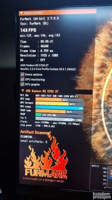 - Test primer: FurMark 1080p pokazuje stabilan rad, GPU temp/hotspot/VRAM prikazani na fotografiji; bez artefakata