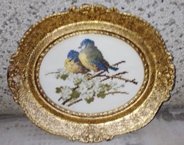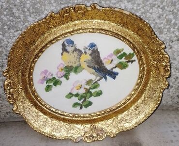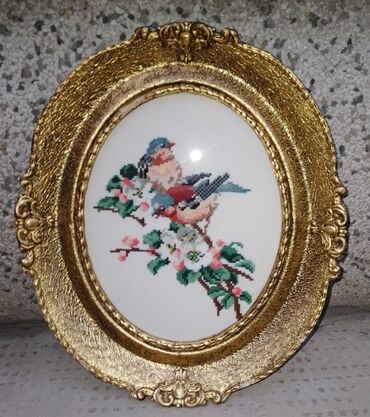 Set ukrasnih zidnih slika – ručni rad gobleni u dekorativnim ovalnim ramovima - Četiri kompozicije pejzaža: zimska idila sa kućicom i snegom; prolećni/brezov drvored sa seoskom kućom; rečni prizor...