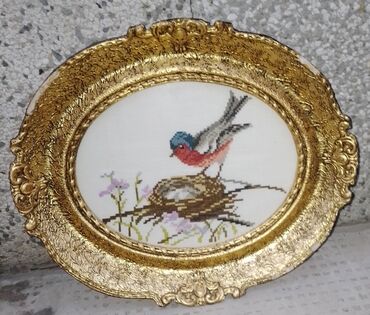 Ručni gobleni u dekorativnim pozlaćenim ramovima svih 5 - Set ukrasnih goblena sa klasičnim motivima: ptičica na gnezdu sa cvećem (ovalni manji format), veliki buket poljskog cveća i bulki u vazi ...