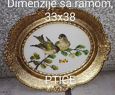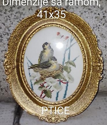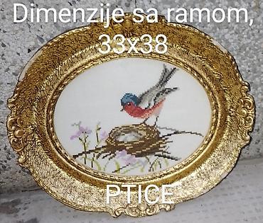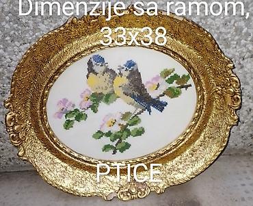 - Motiv: razne scene sa pticama (na granama, pored gnezda, u cveću), rađene krstić bodom na platnu svetle podloge.