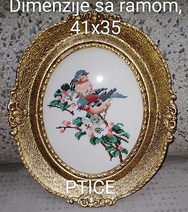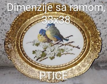 Ručno rađeni gobleni “Ptice” u bogato dekorisanim, ovalnim zlatnim ramovima. Ramovi imaju oštećenja, potrebna zamena. Vidi se na slikama.