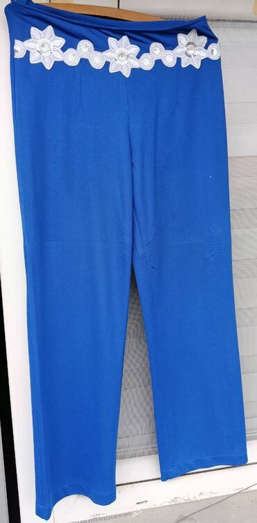 - Pantalone ravnog kroja od prijatnog, elastičnog materijala. U gornjem delu dekorativna bela aplikacija sa cvetnim motivima i sjajnim detaljima duž pojasa.