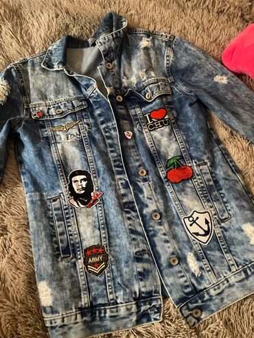 Ženska teksas jakna sa cvetnim čipkanim aplikacijama - Model: kratka