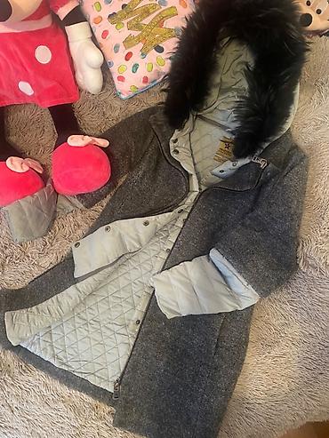 Zimska duga parka/jakna, maslinasto‑sive boje, sa kapuljačom i toplom narandžastom postavom. Model sa dvostrukim kopčanjem: centralni rajsferšlus i spoljašnji red velikih dugmadi. Rebraste ranfle n...