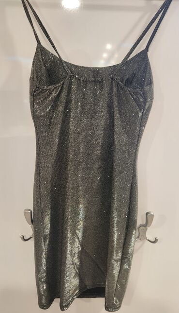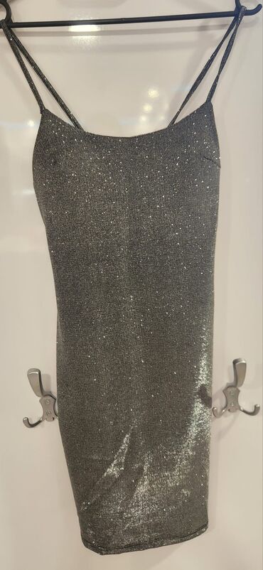 Srebrna mini haljina sa šljokičastim efektom - Model: uska silueta
