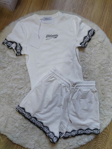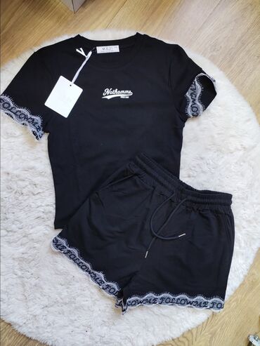 Cena 1600 din Ženski set koji uključuje majicu kratkih rukava i šorts, oba dela u crnoj boji. Majica ima okrugli izrez i beli natpis „Nathana“ na grudima. Rukavi majice su ukrašeni belom čipkom sa tekstom „FOLLOW ME“ koji se ponavlja. Šorts ima elastičan pojas sa učkurom za podešavanje i ukrašen je istom belom čipkom sa tekstom „FOLLOW ME“ na porubu. Pogodan za svakodnevno nošenje i opuštene kombinacije.