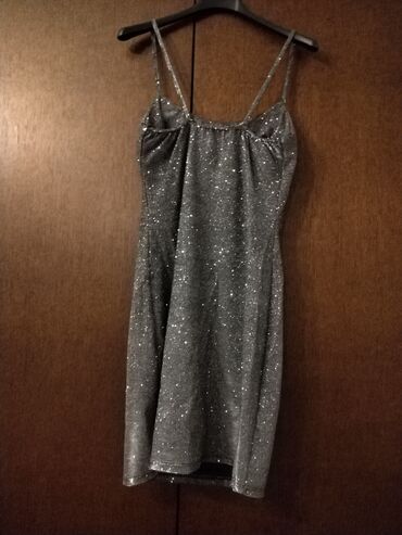 - Haljina 1: uska mini haljina na tanke bretele, rastegljivi materijal koji prati liniju tela. Sjajna površina sa sitnim šljokicama daje izražen „metallic“ efekat pod svetlom. Dužina iznad kolena, blago zaobljen izrez.