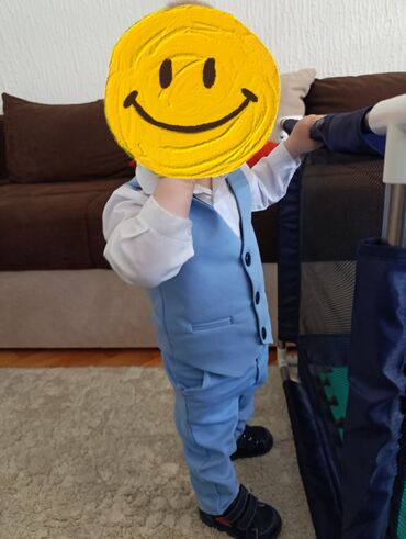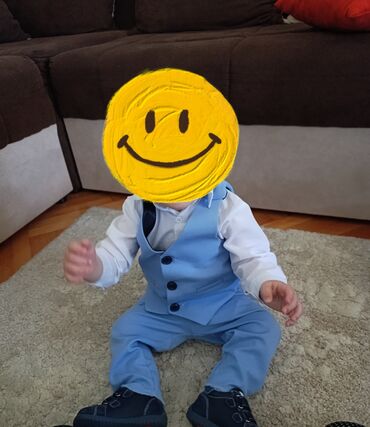 Elegantno odelo za bebe, koje se sastoji od belog bodija sa dugim rukavima, svetloplavog prsluka, pantalona i leptir mašne. Prsluk ima ukrasne džepove i kopča se na dugmad. Idealno za svečane prilike kao što su krštenja i rođendani. Veličina broj 80. Odelo je nošeno samo jednom na krštenju.