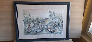 1) Ulje/akril na platnu (impresionistički pejzaž sa kućom, čamcima i drvećem)