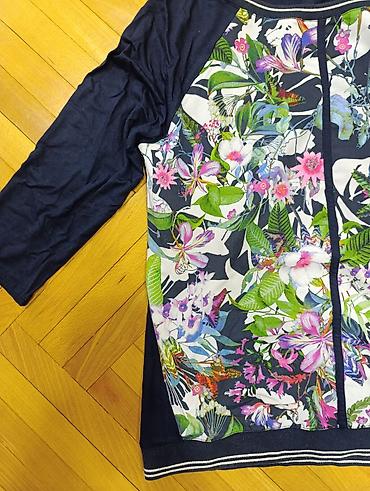 - Materijal: meka, lagana trikotaža; prednji panel sa glatkim, živopisnim floralnim printom (ružičaste, ljubičaste, zelene i bele nijanse na tamnoj podlozi). Zadnji deo i rukavi tamno plavi.