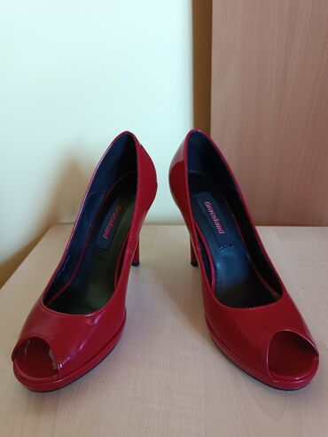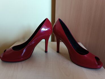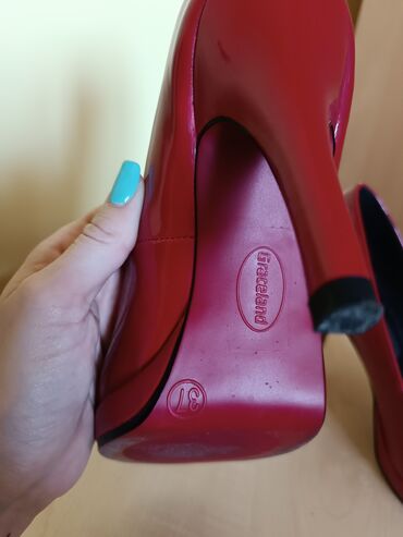 Crvene lakovane salonke marke Graceland sa otvorenim prstima. Elegantne cipele sa visokom potpeticom, pogodne za svečane prilike.