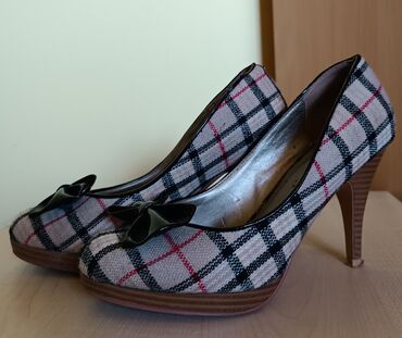 Prelazno vremeŽenske salonke sa kariranim dezenom, ukrašene crnom mašnom od lak kože. Imaju stabilnu štiklu i platformu, što ih čini udobnim za nošenje. Elegantan izbor za različite prilike.