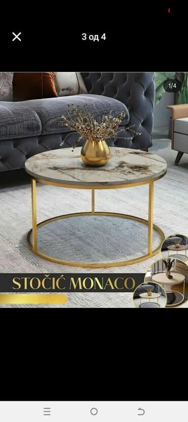 - Materijali: metalna konstrukcija u zlatnoj ili svetloj (srebrnoj) finiš obradi; gornja ploča izgleda kao mermer/visoki sjaj, sa diskretnim venama ili u jednobojnoj varijanti.