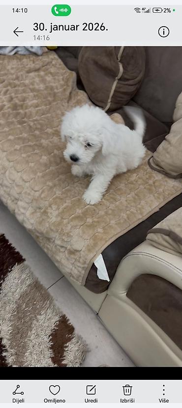 Prelepo štene male rase sa pahuljastom, potpuno belom dlakom. Kompaktne građe, kratkih šapica i okrugle njuškice. Dlaka je meka, kovrdžava i pogodna za redovno četkanje i šišanje na više frizura. Štene je druželjubivo, razigrano i naviknuto na život u stanu; voli maženje i brzo se vezuje za ljude. Idealno za porodice, samce ili starije osobe koje traže nežnog saputnika. Potreban svakodnevni kraći izlazak, osnovna obuka i socijalizacija. Preporučuje se kvalitetna ishrana za štence i redovni veterinarski pregledi, vakcinacija i tretmani protiv parazita. Savršeno kao kućni ljubimac koji ne linja mnogo i lako se održava u urbanim uslovima.