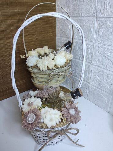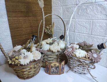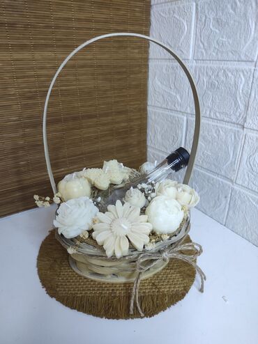 Dekorativna korpa sa cvetnim svećama - Ručno aranžirana korpa od prirodnog materijala sa ručkom. - Unutra set sveća u obliku cvetova: ruže i božuri u nijansama bele i nežno roze/koralne. - Detaljn...