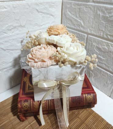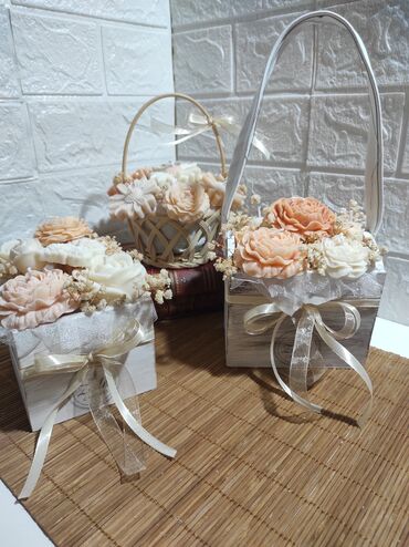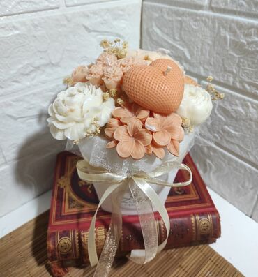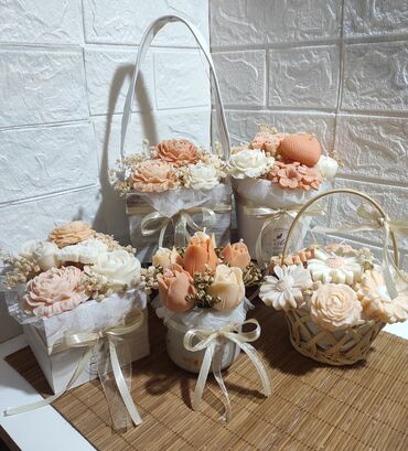 - Ručno rađene sveće oblikovane kao ruže, božuri, margarete i pupoljci, u nežnim nijansama kajsije i bele.