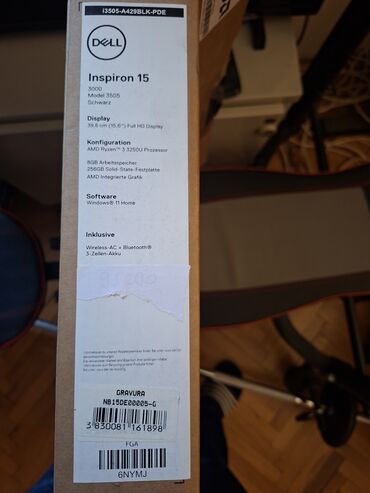 Pogodno za svakodnevni rad, učenje, multimediju i kancelarijske aplikacije. Kompaktan dizajn sa mat crnom završnicom i Dell logoom na poklopcu. Stickeri ukazuju na FHD ekran i AMD Ryzen platformu. Lično donošenje za Beograd i okolinu