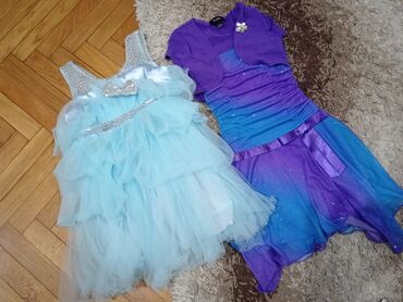- Dve svečane haljine sa tilom: svetloplava sa slojevima i šljokičastim detaljima; ljubičasto–plava sa bolerom i sjajem.