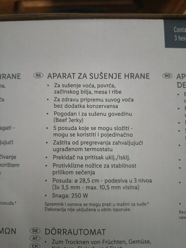- Prečnik posude: 28,5 cm; visina podesiva u 3 nivoa (3 × 3,5 mm do maksimalno 10,5 mm)