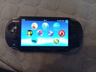 Sony PlayStation Vita (PS Vita) ručna konzola, verzija s OLED ekranom (model 1000). Crna boja. Na slikama se vidi korisnički interfejs i instalirane aplikacije (PS Store, Browser, PS4 Link, Trophies, Messages, Photos, Music, Videos, Calendar, Email, Parental Controls). Na početnom ekranu se prikazuju igre kao što su Uncharted: Golden Abyss, Sly Cooper: Thieves in Time, FIFA 14 i F1 2011.