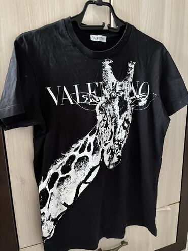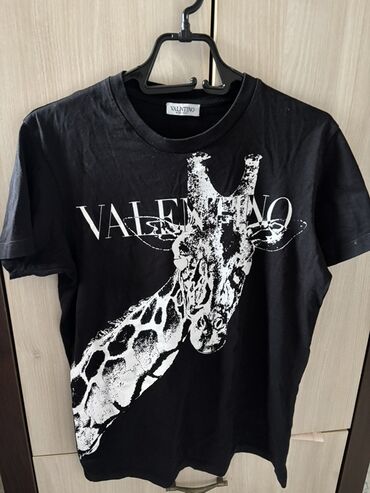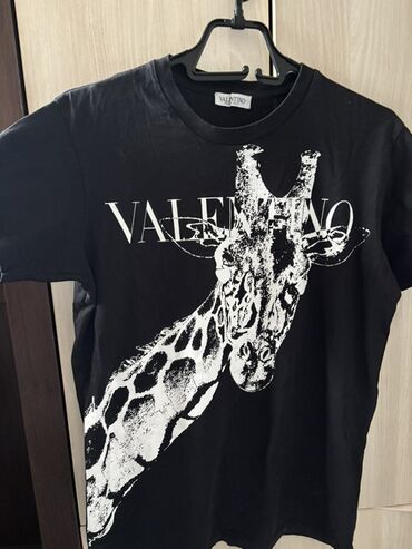 Sa ilustracijomCrna majica sa kratkim rukavima, sa velikim belim printom žirafe preko prednjeg dela. Iznad grafike je istaknut natpis „VALENTINO“. Klasičan okrugli izrez, ravnog kroja. Materijal: pamučna trikotaža (mekana, lagana). Boja: crna sa belim printom. Detalji: