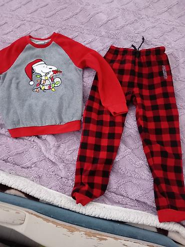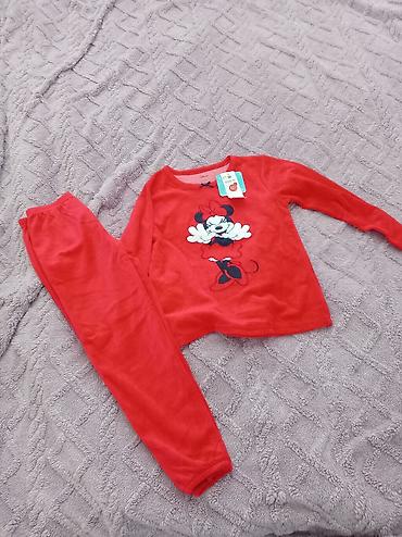- Crvena pidžama (dugi rukavi i dugi donji deo) od mekog velura, sa velikim printom Minnie Mouse na gornjem delu. Elastičan pojas na pantalonama, manžetne na nogavicama. Okrugli izrez, mali dekorativni mašnić na okovratniku. Na etiketi naznačena visina 125 cm.