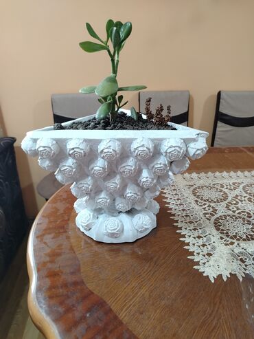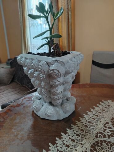 Dekorativna saksija od gipsa/betona sa reljefnim motivima ruža. Trokutasta gornja ivica sa širokim otvorom za sadnju, bogato ukrašeno telo sa nizovima ruža i stabilno kružno postolje sa dodatnim ukrasima. Bojena u sjajno belu boju. Pogodna za sukulente, kaktuse ili sobne biljke; može se koristiti kao centralni ukras na stolu, polici ili prozorskoj dasci. Čvrsta i teška konstrukcija obezbeđuje stabilnost. Dimenzije približno: visina oko srednja (stolna), otvor dovoljno dubok za manju do srednju biljku. Idealan komad za klasičan ili romantičan enterijer, kao i za poklon ljubiteljima cveća i unikatnih ručno rađenih ukrasa. Biljka na fotografiji ilustruje upotrebu. Izrada po porudžbini, ovo je za našu krasulu napravljeno