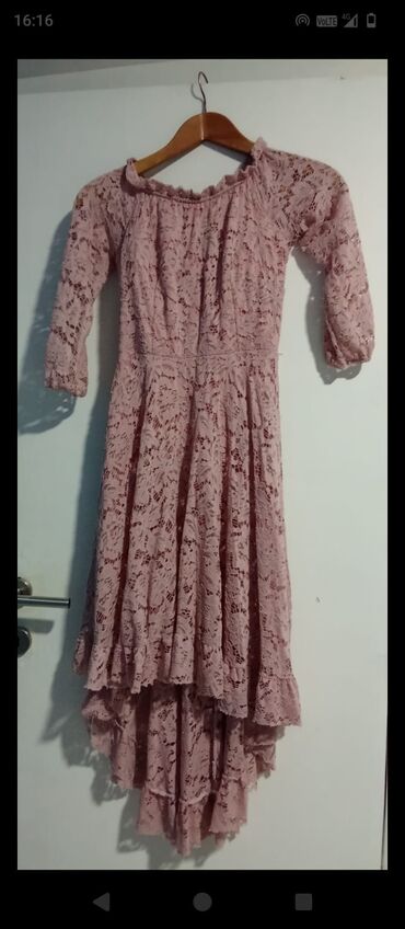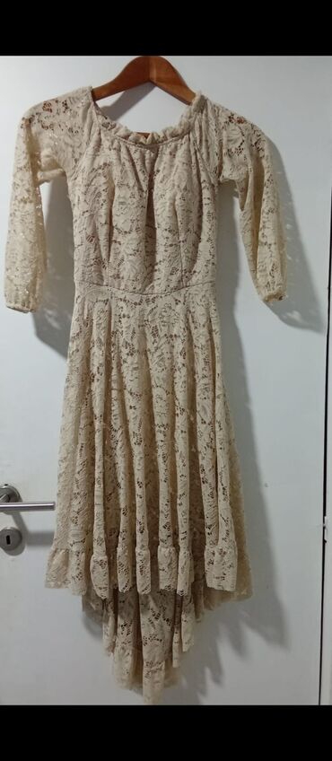 Romantična floralna čipka, blago nabrani gornji deo, elastičan izrez sa sitnim volanom, naglašen struk i slojevita asimetrična suknja sa volanima (duže pozadi). Pogodne za proslave, koktele i fotografisanja.