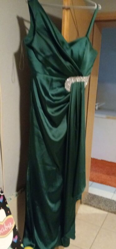 - Svečana duga haljina u smaragdno zelenoj boji, satenski izgled. Asimetričan kroj sa bogatim naborima, bretele, V-izrez. Ukrasni detalj u struku sa srebrnim kamenčićima, spuštena draperija sa jedne strane. Idealna za svečane prilike.