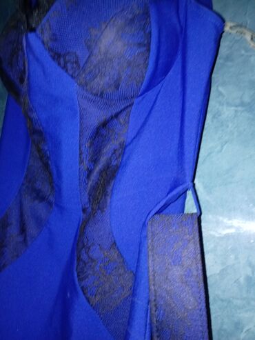 - Elegantna haljina u kraljevski plavoj boji: rastegljiv materijal, urezani paneli sa providnim čipkastim detaljima u tamnoplavoj, uska silueta, bez rukava sa diskretnim naramenicama.