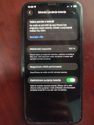 - Baterija: u iOS podešavanjima prikazuje Maksimalni kapacitet 100%; uključeno „Optimizovano punjenje baterije“