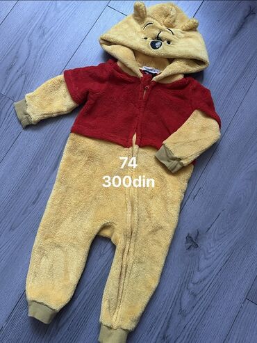 - Žuto-crveni plišani kombinezon sa likom mede na kapuljači, rajsferšlus napred, rebraste ranfle na rukavima i nogavicama. Veličina: 74. Cena: 300 din.